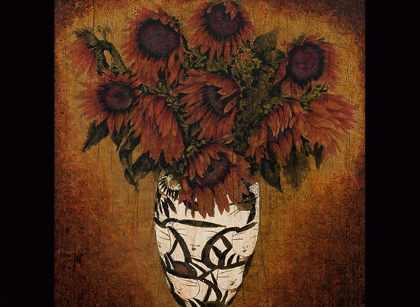满布纹理的金箔在色漆笼罩下,减了一份闪亮,多了一份昏暗。画家对于画面整体的把握非常的到位,每一个细节凸显了葵花特殊的造型美。